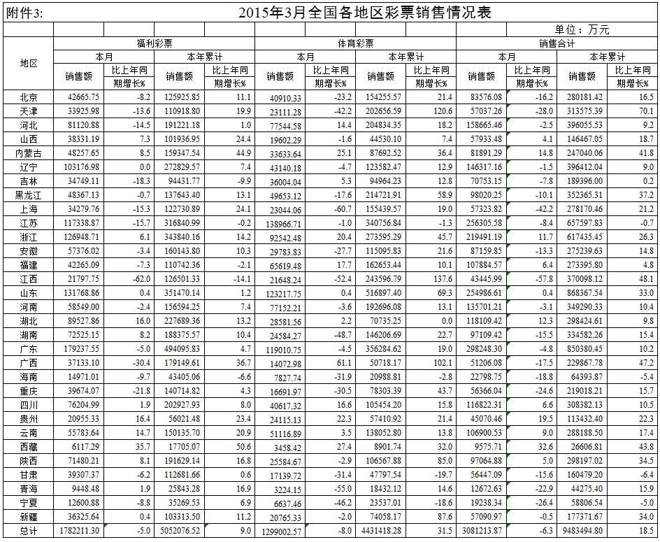 1月至3月累计,全国共销售彩票948.35亿元,同比增加148.01亿元,增长18.5%。其中,福利彩票机构销售505.21亿元,同比增加41.84亿元,增长9.0%;体育彩票机构销售443.14亿元,同比增加106.18亿元,增长31.5%。