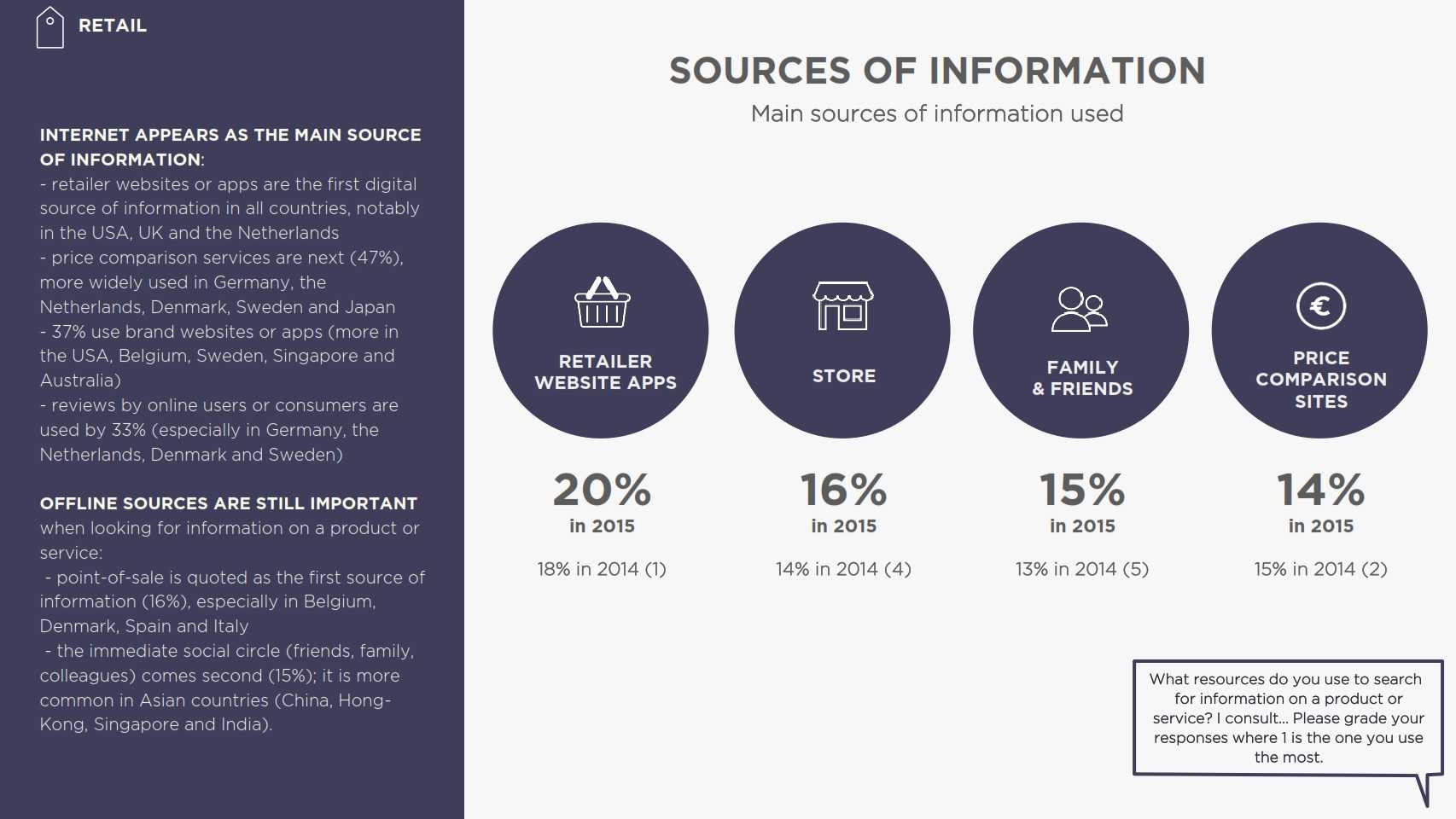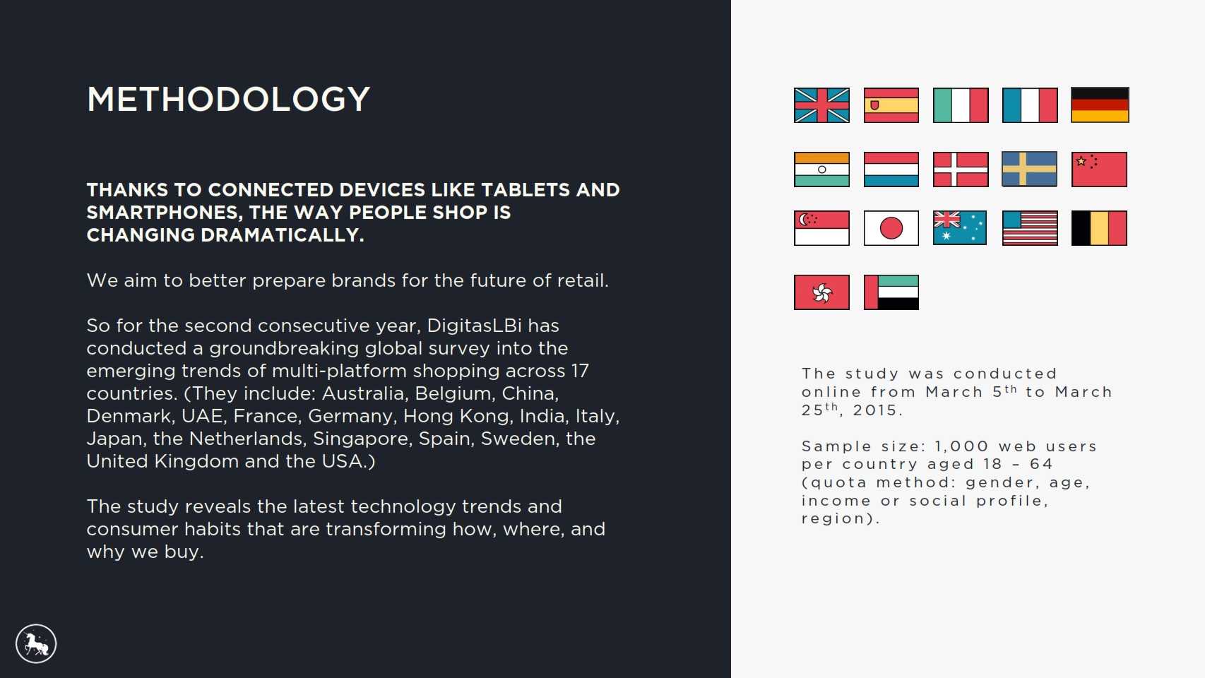 DigitasLBi乐必扬的Connected Commerce互联购物调查至今已经是第四年了。今年这项研究涵盖了17个国家和地区,而去年是12个。这些国家和地区包括澳大利亚、比利时、中国、丹麦、法国、德国、中国香港、印度、意大利、日本、荷兰、新加坡、西班牙、瑞典、阿联酋、英国和美国。2015年的线上调查由IFOP在 2015年3月5日到3月25日完成;采用定额法,每个国家抽样选取了1000名年满18岁的网络用户作为样本(性别、年龄,收入和社会情况及地区)。