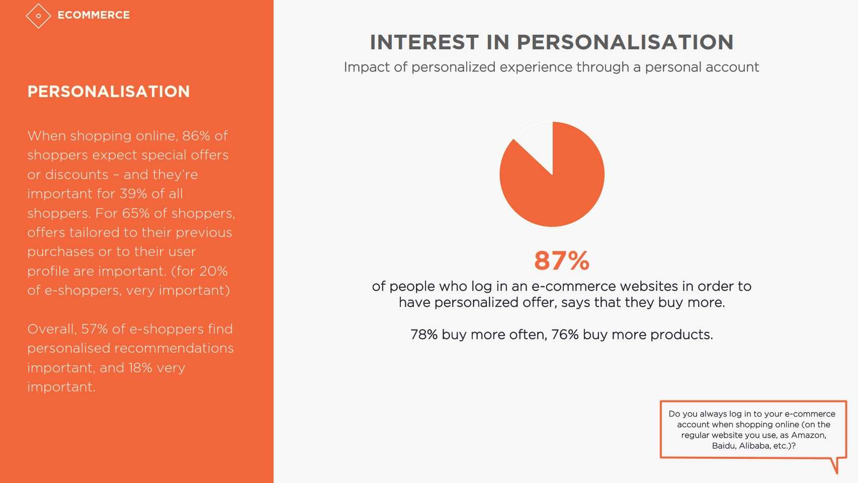 根据DigitasLBi乐必扬的互联购物调查,个性化的购物体验是吸引消费者的必要环节。62%的受访者表示,当享受到个性化的购物体验时,他们会买更多,或更频繁地买。更有进一步27%的受访者表示在线购物时,会积极寻找提供个性化的服务。75%的受访者会登陆记录他们之前行为(占40%)或提供个性化产品(占35%)来迎合他们个人偏好的电商网站。