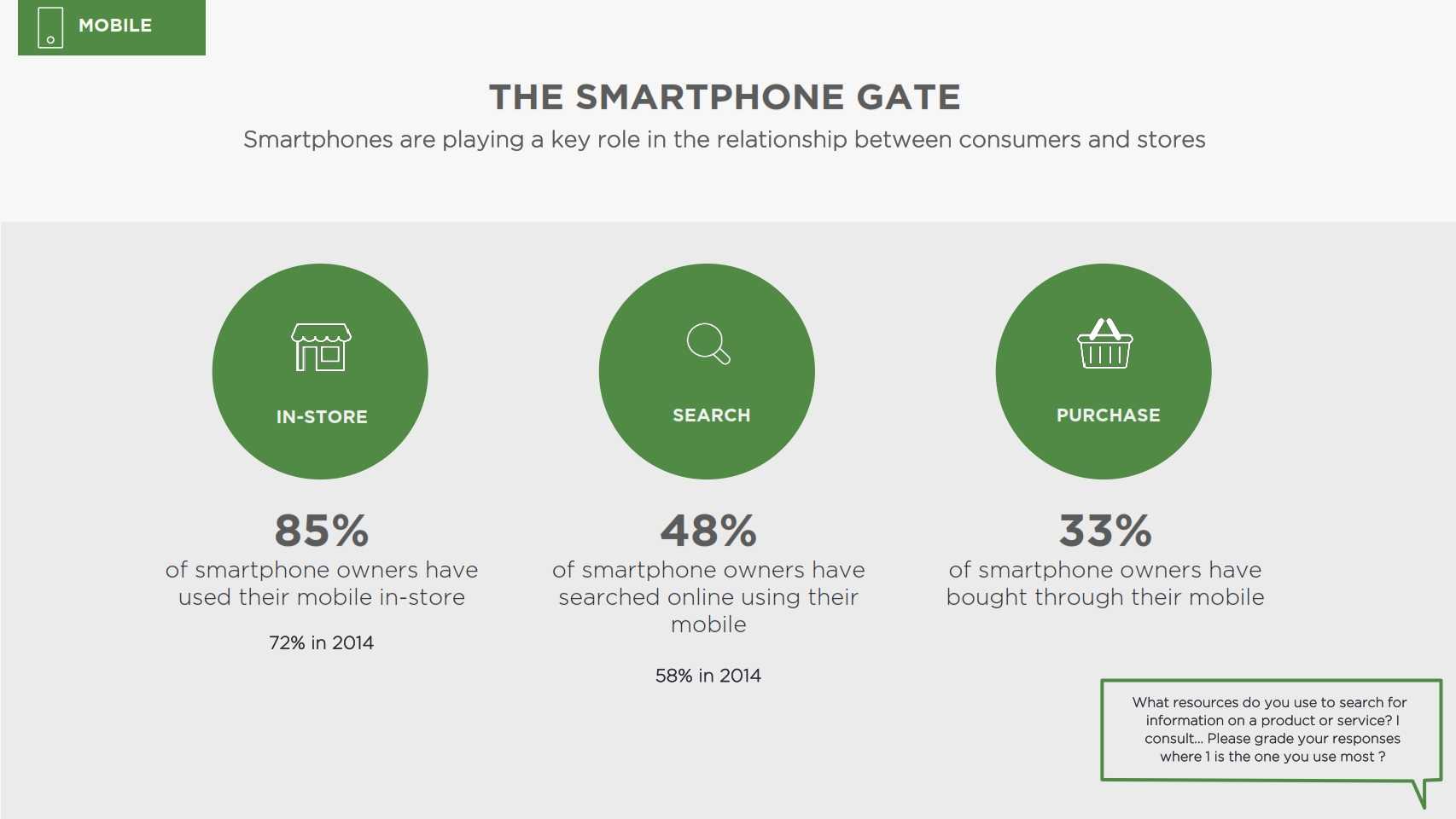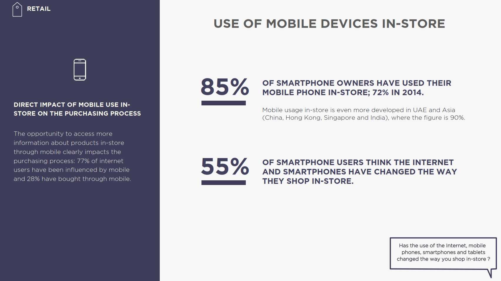 DigitasLBi Commerce部门的管理合伙人Jim Herbert 说,“消费者希望通过比以往更多样化的购物方式来节约时间和金钱。移动端正成为在购物时寻找大量优惠的优选平台。被访者中85%在店内使用智能手机,且有55%的消费者称智能手机已经彻底改变了他们的购物方式”。“我们也看到,62%的智能手机使用者很乐于使用他们的设备直接在店内支付。随着美国苹果支付功能的发布和店内支付竞争领域的兴起,2015年必定是属于移动支付的一年。移动化会完全改变零售体验,品牌和商家们显然会更加注重到这一点。”
