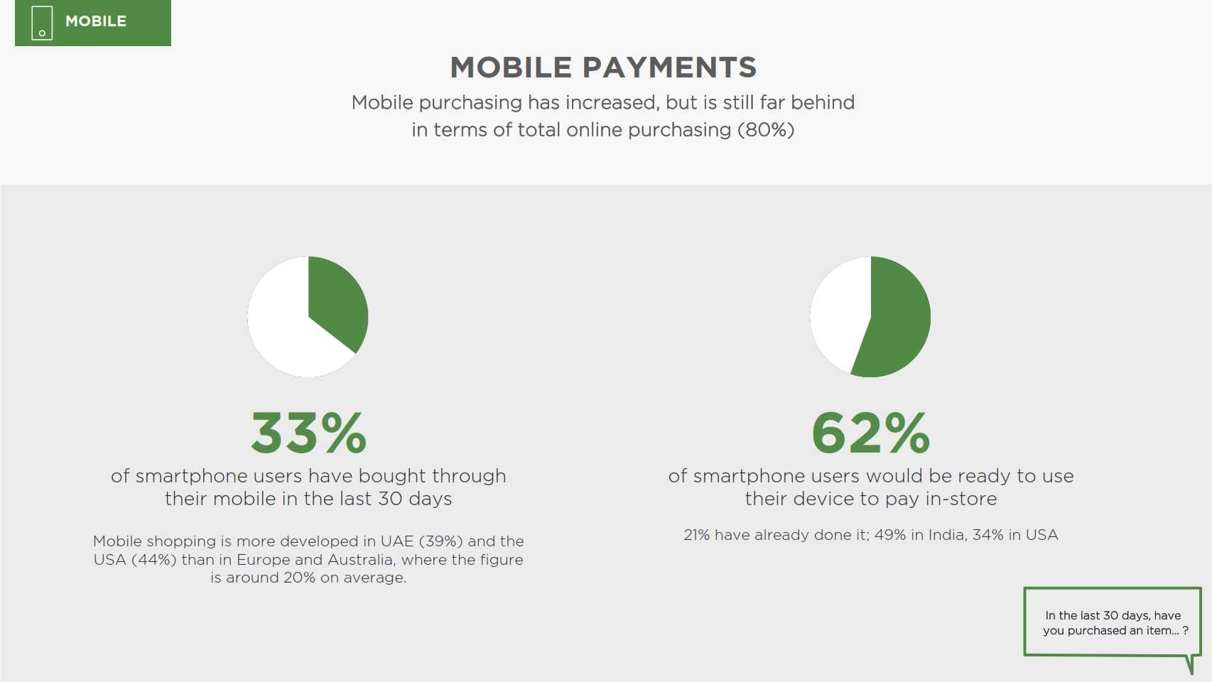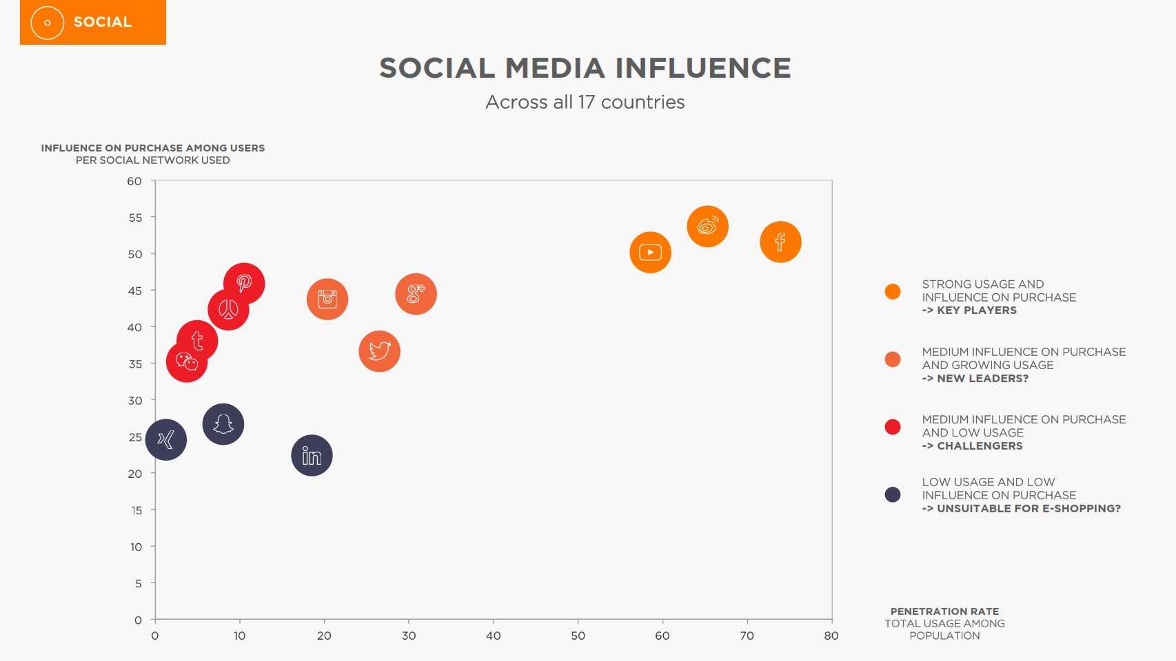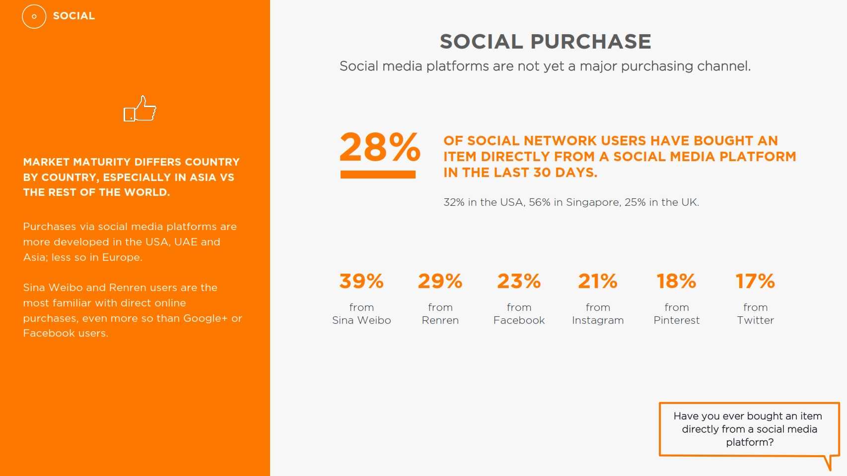 全球28%的社交网络用户称直接通过社交媒体平台购买过商品,可见社会化购物迅速获得的吸引力。排名第一的阿联酋有56%的受访者表示他们有通过社交网站购物。在中国,该比例达到51%。其中微博占比43%,微信占比53%。其他社交方式如在线评论,也在购买过程中非常重要:全球平均66%的消费者在线购买时会先阅读评价( 在中国该比例高达91%),36%的消费者在线下购物时也会浏览社交网站上的产品评论。