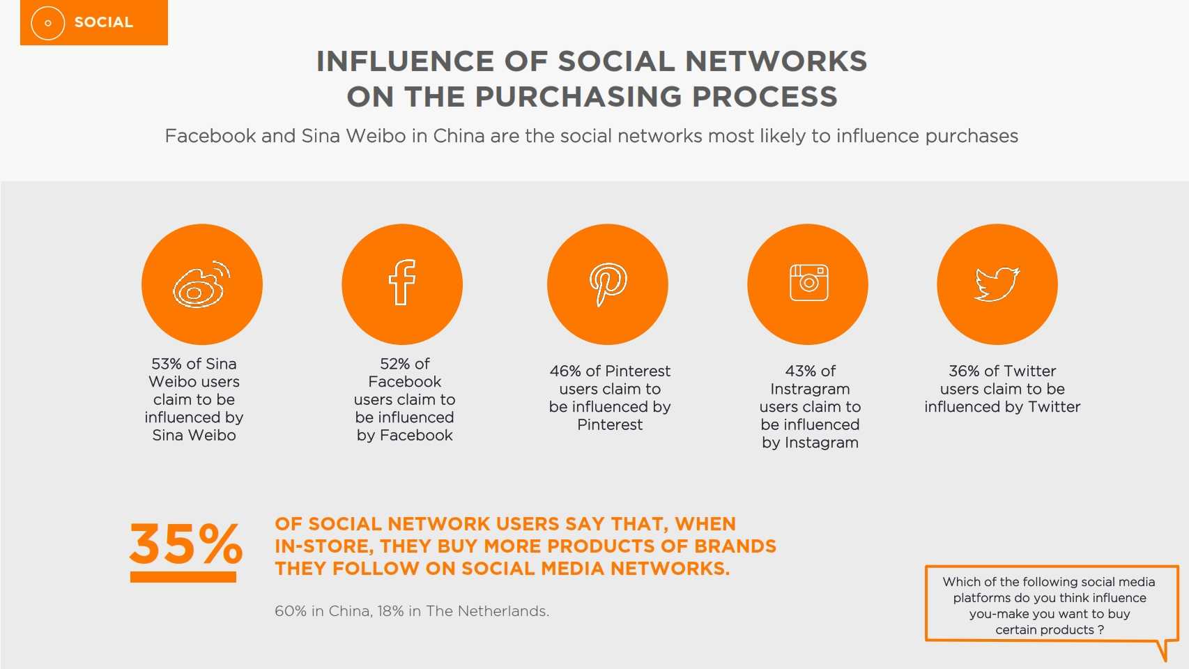 DigitasLBi 乐必扬的互联购物研究表明,社交媒体在同时增长线上和线下的购买数量。Facebook一半以上(52%)的用户承认社交网络影响了他们的购物方式,这在所有社交平台中遥遥领先(而2014年只有36%的用户这么认为)。与之相比,Pinterest的该比例为46%,Instagram为43%,而Twitter是36%。在中国,有65%的微信用户和60%的微博用户也表示社交网络影响了其购物方式。