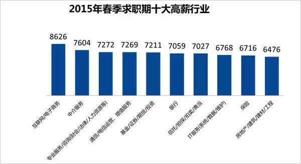 智联招聘4月下旬针对2015年春季求职期公布的《2015年春季中国雇主需求与白领人才供给报告》显示,十大高薪行业方面,互联网/电子商务行业以8626元的月薪高居榜首,中介服务业紧随其后位居第二,约7604元;排名第三的是专业服务/咨询(财会/法律/人力资源等),平均月薪为7272元。