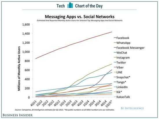 全球用户最多的通信应用及社交平台上中,前三位是 Facebook、Facebook 去年以190亿美元收购的 WhatsApp 以及 Facebook 推出的 Facebook Messenger, 这家公司在3月的每日活跃用户高达9.36亿,移动端的活跃用户接近8亿。