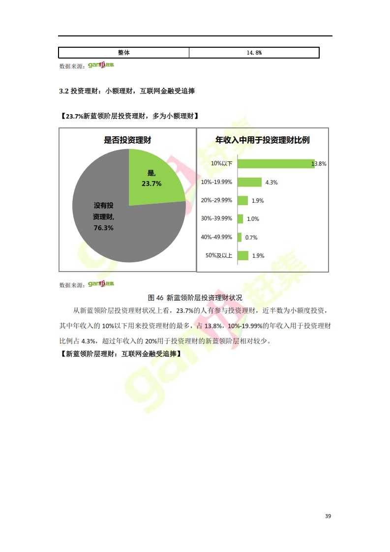 《报告》称,在理财方式上,新蓝领的观念与父辈大不相同,从之前的“存”,正转向现在的“理”。23.7%的新蓝领表示有参与投资理财,其中近半数为小额度投资。而这群新蓝领中,年收入的10%以下用来投资理财的最多,占13.8%,10%~19.99%的年收入用于投资理财比例占4.3%,超过年收入的20%用于投资理财的新蓝领阶层相对较少。