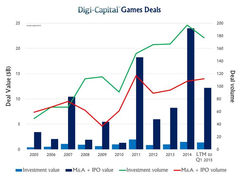 去年,游戏企业并购和首次公开募股(M&As and IPOs)达到240亿美元。Microsoft以25亿美元的价格收购Mojang;Facebook以20亿美元收购Oculus;King 上市。到2015年3月的12个月里游戏企业并购和首次公开募股达122亿美元,是第三高的记录,但是只达到2014年的一半。去年,对游戏企业的投资比三年前低25%,到2015年3月的12个月里又下降了7%(14亿美元)。
