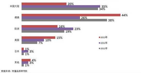 财富品质研究院调研显示,2012年中国消费者文化消费品消费地突破了2011年的“1+1+1”法则,文化消费品购物决策地的重心偏向境外地区,除港澳地区(26%)外,欧洲是中国境外旅游消费的重心,达23%,其次是美国(10%),而日本跌至3%。2013年,境外消费趋势依然持续,不同的是,港澳成为中国消费者最爱购买文化消费品的地区,比例高达44%,选择去欧洲的消费者与去年相比,下降了8%;在美国购买文化消费品牌的则上升了5%。与此同时,2013年中国高资产人群的海外购买文化消费品的倾向同去年相同,仍然是愈加明显,尤其以身价过亿的富裕阶层为甚,51%的过亿富裕阶层倾向于境外消费。