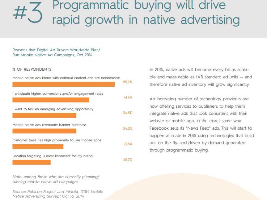 - 程序化购买将推动原生广告迅速增长。利用程序化购买,实施原生广告会比以往更加容易。另外,由于原生广告比IAB标准的广告单元(IAB standard ad units)效果更好,发行商将会收取更高的CPM费用——在移动端上将更是如此。