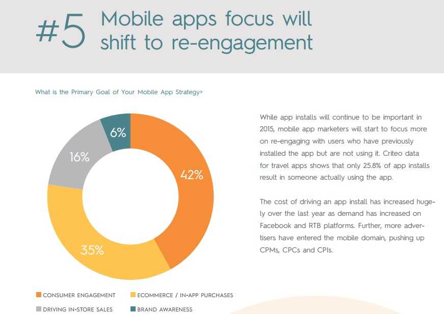 - 由于42%的零售商高管和广告代理商将消费者互动作为移动应用战略的首要目标,零售商将对移动应用内再互动(app re-engagement)给予高度重视。
