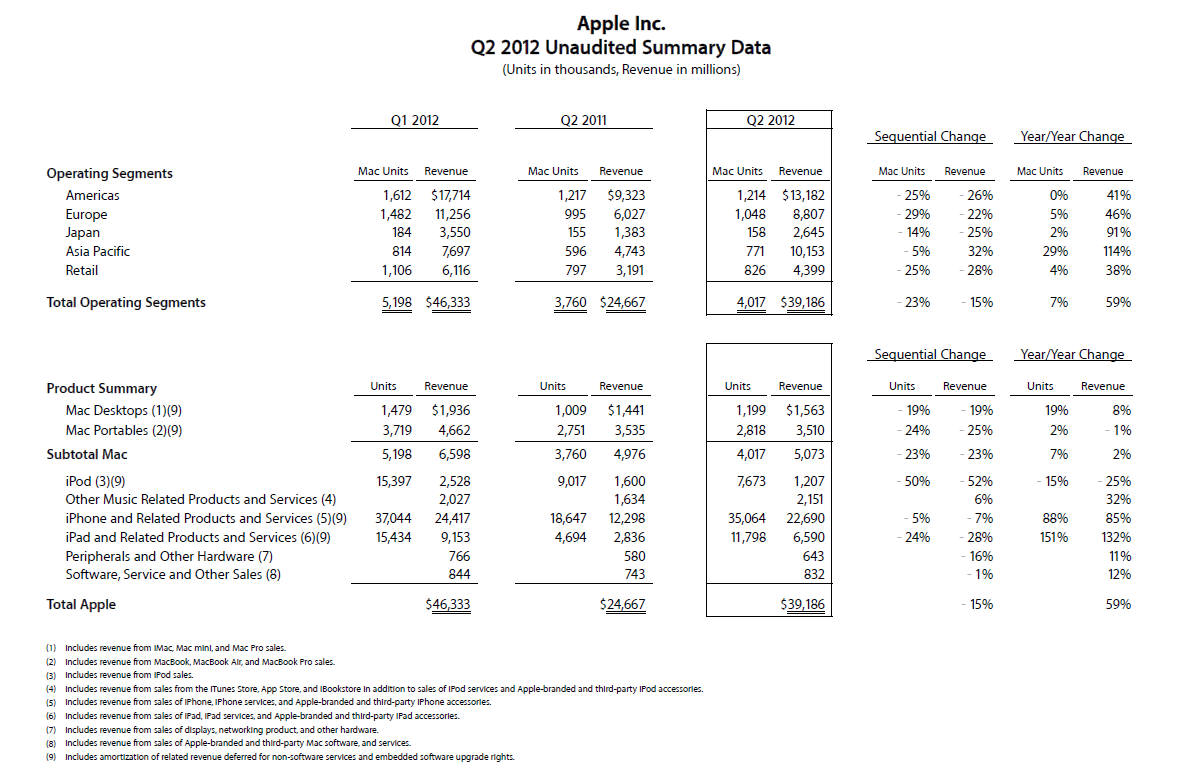 即便如此,2012年第二季度的销售数据仍然符合分析师预测。苹果最大的两个产品,iPhone和iPad销量也只是分别下降了5.3%和23%。