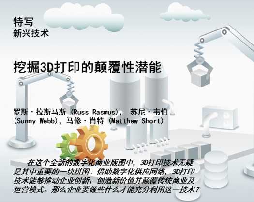 同个人电脑和互联网刚刚问世时一样,虽然3D打印技术潜力无限,但现阶段还无法完全释放出来。不过,在某些领域,3D打印技术确实带来了潜在机遇,比如制造业。因为3D打印技术令数字世界和现实世界之间的界限变得模糊,而在埃森哲看来,这正是颠覆了很多产业的主要力量。