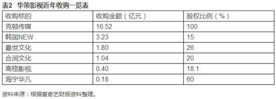 首先,影视行业异军突起。相关数据显示,2014年,在影视行业并购中,有42家上市公司发起并购,并购交易总金额合计超过900亿元,其中以百事通492亿重大资产重组方案最为庞大。而最为活跃的则是华策影视,2014年发起四起并购合计耗资5.07亿元。近些年来,华策影视不断以影视内容为核心,通过不断的并购逐步覆盖网络、游戏、动漫、海外电影等市场,具体见表2。