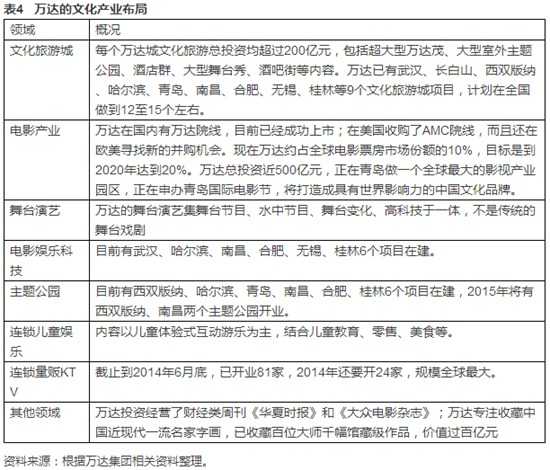 2014年,跨界并购东风劲吹,大量来自制造业、食品、农林牧渔等传统或周期性行业的公司,纷纷通过并购涉足文化影视、移动互联网、医疗健康、手游等新兴行业。而万达集团更是从从房地产高调转型进入文化传媒产业,把文化产业作为其支柱产业发展,成立了专门的文化产业集团,2014年,其文化产业集团的年收入高达341.4亿元,同比增长32.3%,其在文化产业的布局具体见表4。