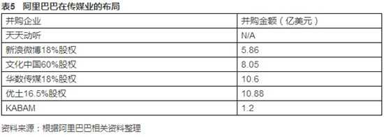互联网正在布局生态系统,而传媒业是其生态系统不可或缺的重要组成部分,阿里巴巴是其中野心最大的,目前已经投资了大量的传媒企业,具体见表5。