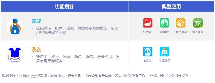 家务类社区O2O应用根据功能不同,可以分为家政和洗衣;家务类社区O2O应用为用户提供各种上门服务的家务服务;洗衣类则是专注于为用户洗衣服