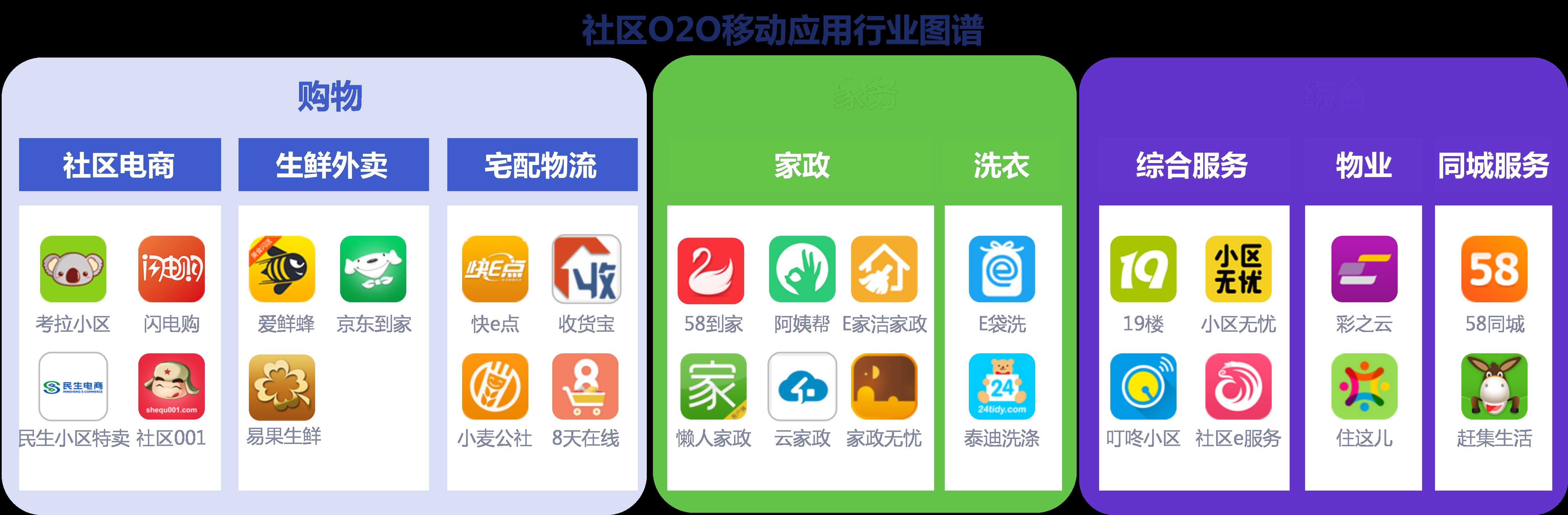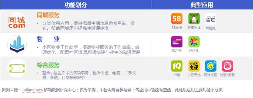 综合类社区O2O应用根据功能不同,可以分为同城服务、物业和综合服务三类;同城服务类应用即分类信息应用,提供各类生活服务信息;物业是整合了传统物业的各类功能;综合服务则涉及到社区生活的各方面