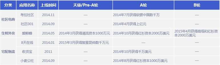 购物类社区O2O应用中,社区电商两家获得A轮融资;生鲜外卖类的爱鲜蜂获得B轮融资;宅配物流两家获得A轮融资;从融资情况看,各类应用还有很长的路要走