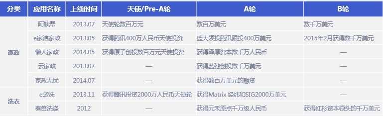家务类社区O2O应用中,家政类五家获得A轮融资,其中阿姨帮和e家洁家政获得B轮;洗衣类两家获得A轮融资,其中泰迪洗涤已经完成红杉资本领投的B轮