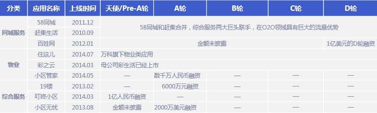 综合类社区O2O应用中,同城服务类市场已经发展成熟,58同城和赶集合并,百姓网拿到一亿美元的D轮融资,中三家同城服务公司均开始在O2O领域积极发力;物业类中小区管家完成数千万人民币融资;综合服务类应用均还停留在天使轮或A轮
