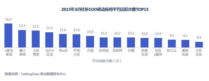 社区O2O移动应用平均活跃次数TOP15中,E家洁家政以16次占据第一位;排名前两位的均是家政类应用