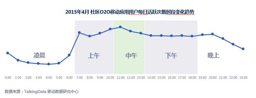 社区O2O移动应用整体活跃时段中,峰值在中午11:00;整体来看,凌晨用户较少使用社区O2O应用