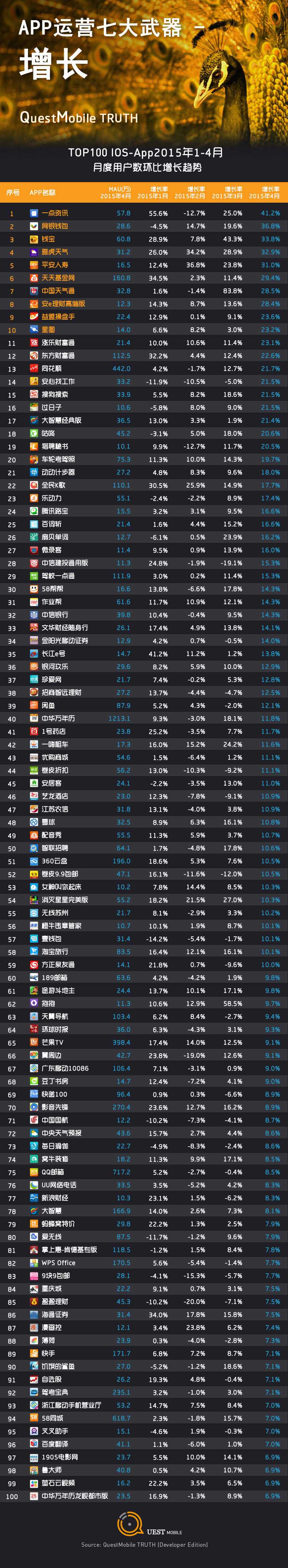 QuestMobile数据显示,2015年4月份IOS端MAU增长率 Top 100榜单中,增长率突破30%的有五家,分别是一点资讯、网银钱包、钱宝、雅虎天气、平安人寿,其中,钱宝4月份MAU达到60.8万,一点资讯57.8万,其余的都较小。不过,相比钱宝,一点资讯的增长态势非常奇怪,大起大落非常明显,各位不妨猜猜其原因。