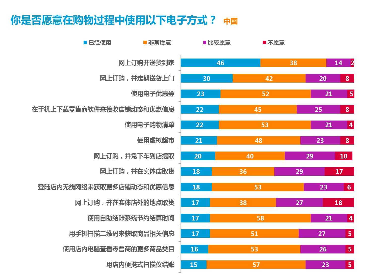 调查还显示,18%的中国受访者表示会登录店铺Wi-Fi来获取产品信息或价格,17%的人则会通过扫描二维码的方式获取所需信息,使用店内电脑查阅产品信息的消费者占16%。分别有75%、78%和79%的中国受访者表示未来愿意尝试这些电子方式在实体店铺购物。