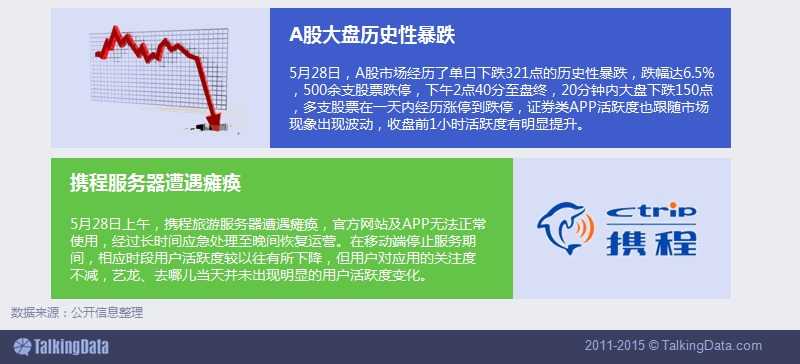 5月28日,A股市场的历史性暴跌以及携程服务器的长时间瘫痪成为公众议论焦点,而两个大事件背后移动端应用的用户使用行为也出现了相应变化。