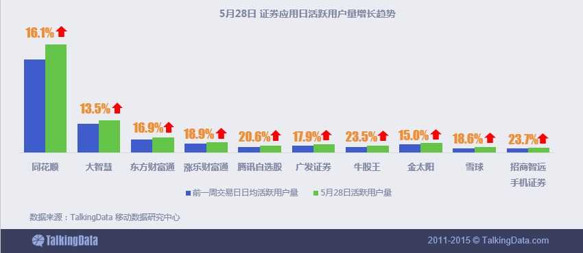 5月28日,各证券类应用的日活跃用户量较前一周均呈现13%-25%左右的增长,股市的大幅震荡激发了股民证券应用的使用活跃度。