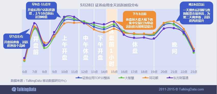 5月28日当天,证券应用用户活跃时段与股市休开盘时间吻合,上午9点开盘后活跃度达到峰值,在下午3点休盘前,由于大盘遭遇大幅下跌,成交行为在该时段相对集中,应用活跃度也相应有明显提升。