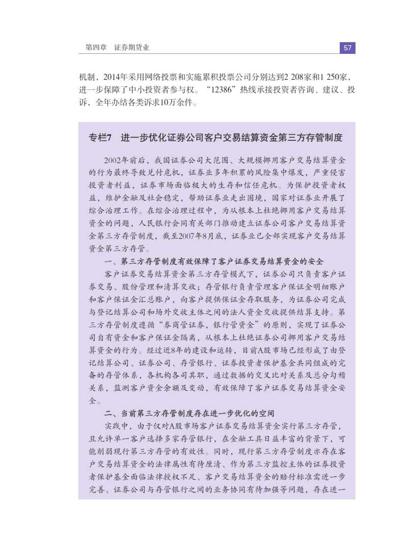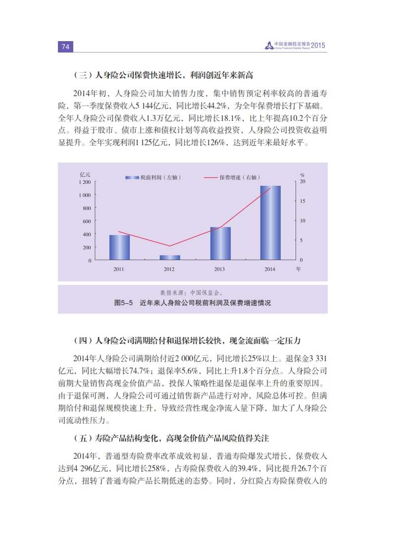 报告认为,2014年我国金融业健康发展。银行业资产负债规模继续扩大,支持“三农”、小微企业力度不断加强,资本充足水平持续提高,拨备整体稳定,风险弥补和损失吸收能力较强。部分行业、领域和地区的风险有所显现,部分表外业务和影子银行潜在风险值得关注。证券期货业整体运行稳健,行业创新能力持续提升,市场基础性制度建设稳步推进,监管转型继续深化,双向开放取得积极进展。个别公司退市风险值得关注,部分创新业务合规风险管理有待加强。保险业资产规模持续增长,保费收入快速增加,资金运用收益大幅提高,经营效益显著提升。部分人身险公司流动性压力加大,保险投诉量有所增长。