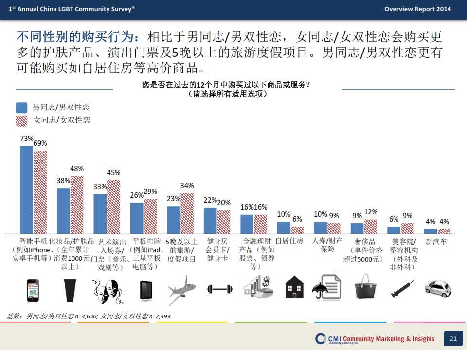相比男同/双性恋者,女同/双性恋者会购买更多护肤品、演出门票和5晚以上的旅游度假项目。男同/双性恋者更有可能购买自居住房等高价商品,但在化妆品/护肤品、健身房会员卡/健身卡、奢侈品、美容院/整容机构等领域的消费潜力也不可小觑。↓