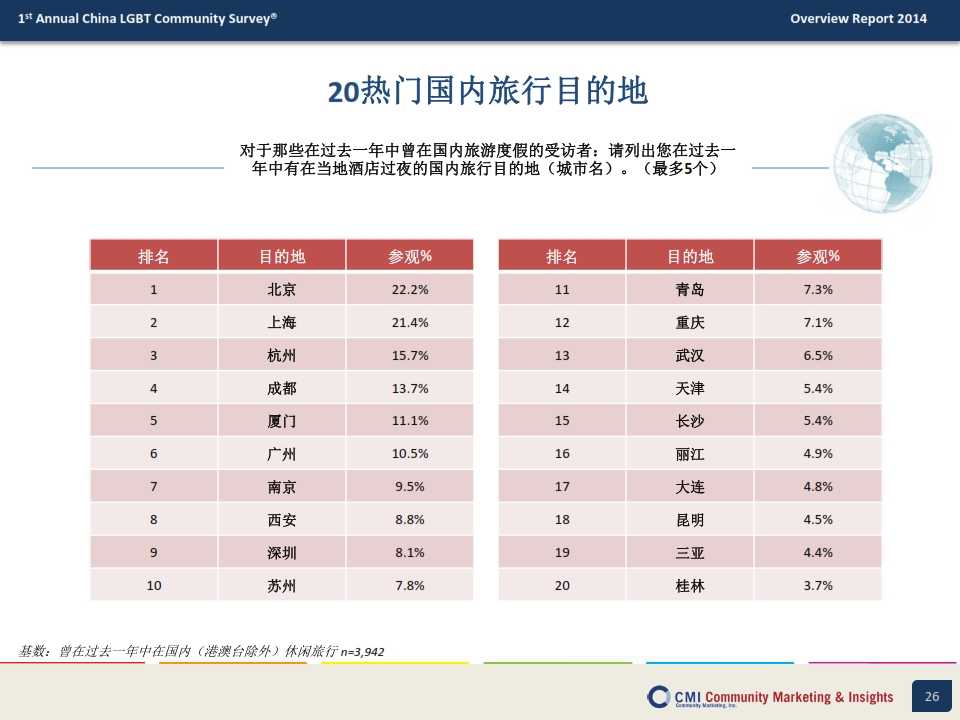 女同/双性恋者在国内和国外旅游的比例都高于男同/双性恋者。68%的女同/双性恋者和53%的男同/双性恋者在过去12个月里有过至少一次在国内(不包括港澳台)的休闲旅游经历。中国LGBT最喜爱的旅游目的地是北京、上海、杭州、成都和厦门。近几十年来旅游一直是国际粉红经济的重要组成部分,本届调查表明中国具有类似情况。↓