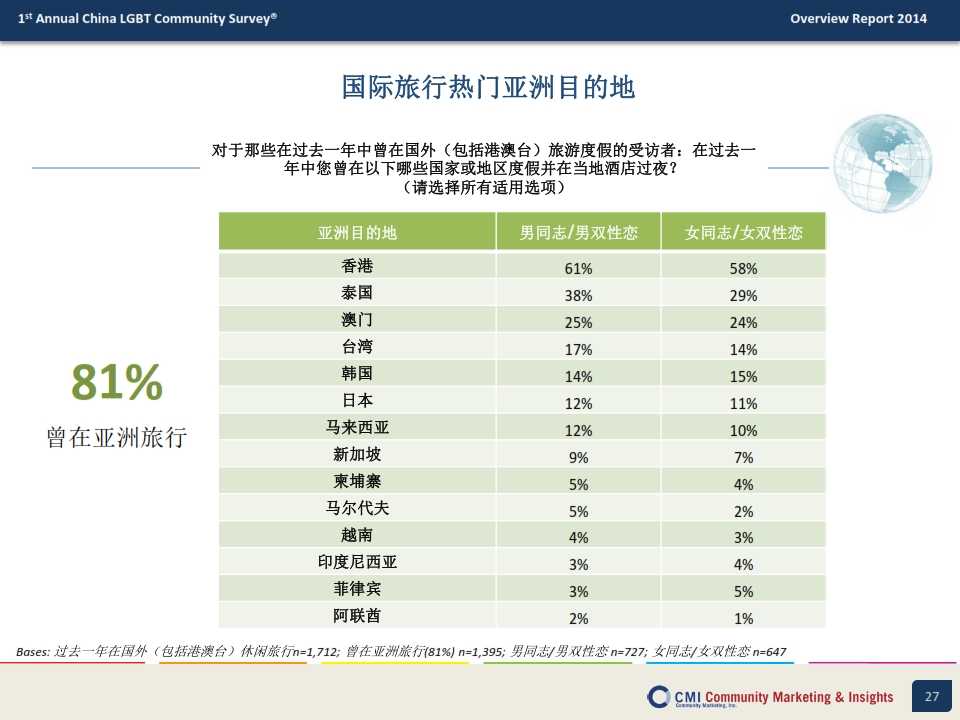 受访者中,男同/双性恋者占65%,女同/双性恋者占34%。但相比男同/双性恋者,女同/双性恋者更倾向于向朋友、家人和同事出柜,她们在国内外旅游的比例也更高。↓