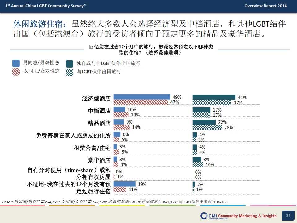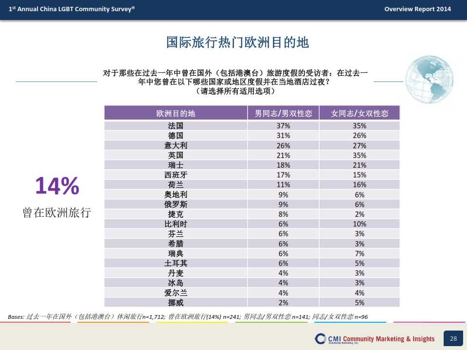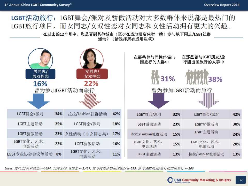 大多数LGBT人士为了参加LGBT舞会/派对或骄傲活动而旅行,其中男同/双性恋者对舞会/派对感兴趣的比例(34%)明显高于女同/双性恋者(18%),而女同/双性恋者对女同性恋社群的活动表现出更大兴趣。↓