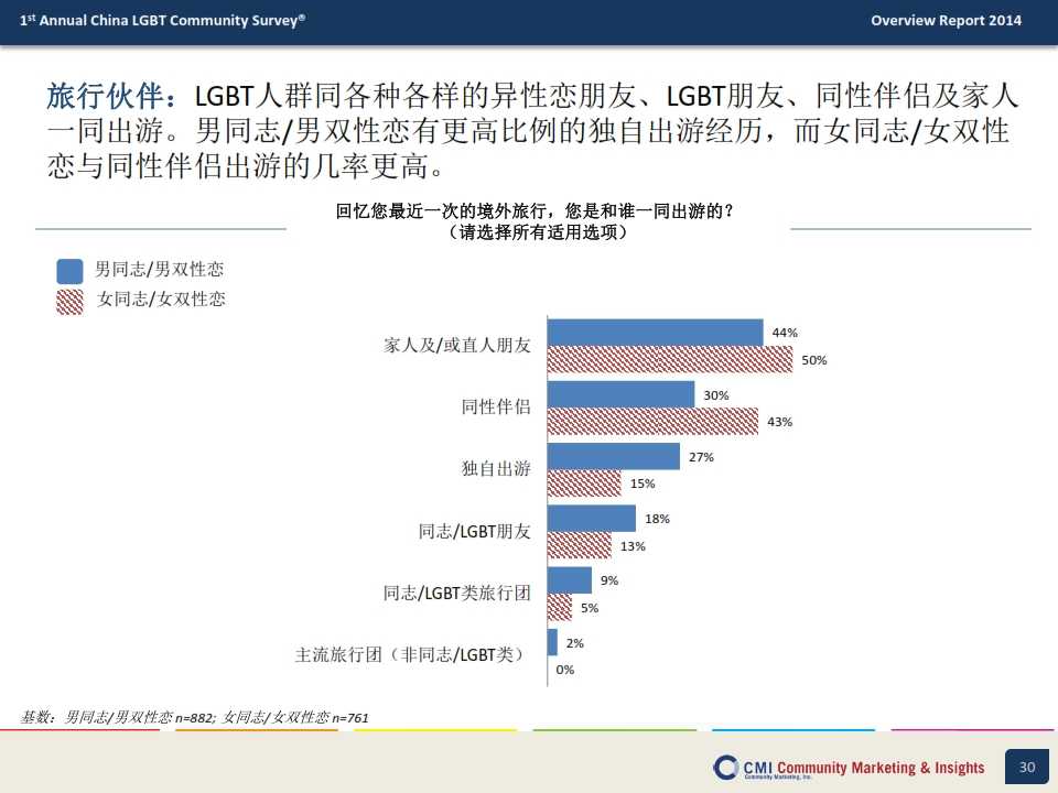 LGBT人群会与各种各样的异性恋朋友、LGBT朋友、同性伴侣或家人一起出游,但男同/双性恋者独自出游的比例更高,而女同/双性恋者与同性伴侣出游的几率更高。↓