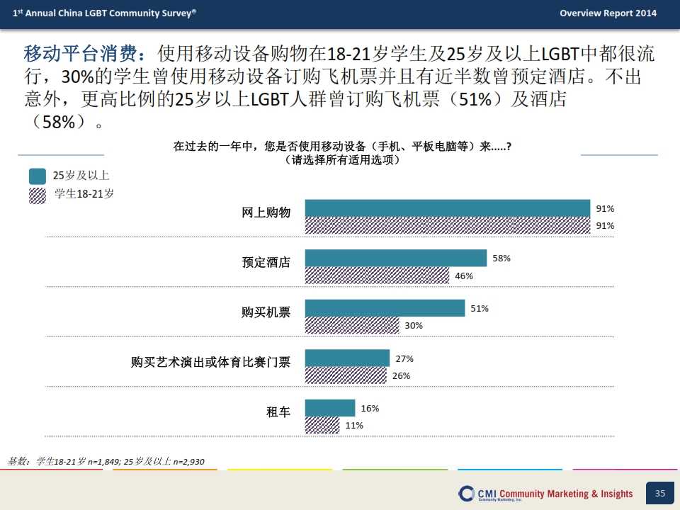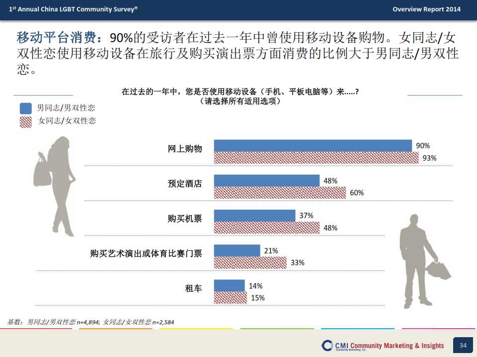 90%的受访者在过去一年中曾使用移动设备购物。女同/双性恋者使用移动设备在旅行和购买演出票方面消费的比例大于男同/双性恋者。↓