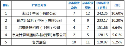 梅花网发布的2012年3月份的杂志广告主TOP50。据梅花网监测数据显示:在2012年3月1日-3月31日期间,全国电子电脑类杂志广告主监测中,索尼发力,一跃而上,位居第一。戴尔紧随其后。