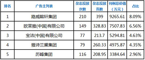 在时尚类杂志广告主监测中,路威酩轩集团位居第一、欧莱雅、宝洁位列第二、第三的位置。