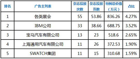 在经管类杂志广告主监测中,各类展会、IBM公司、宝马位列前三甲。