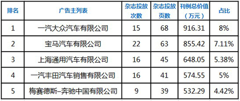 在汽车类杂志广告主监测中,一汽大众、宝马及上海通用占据了前三的位置。