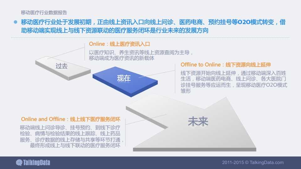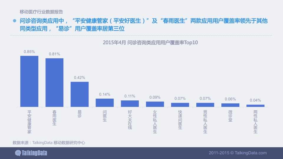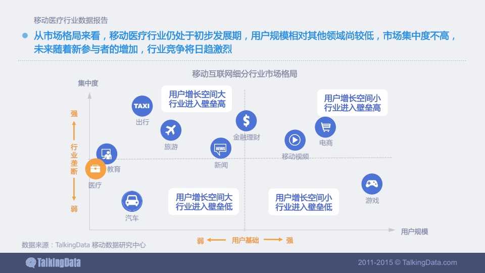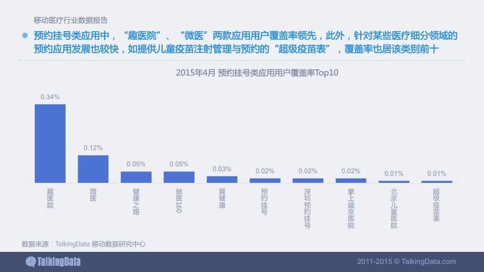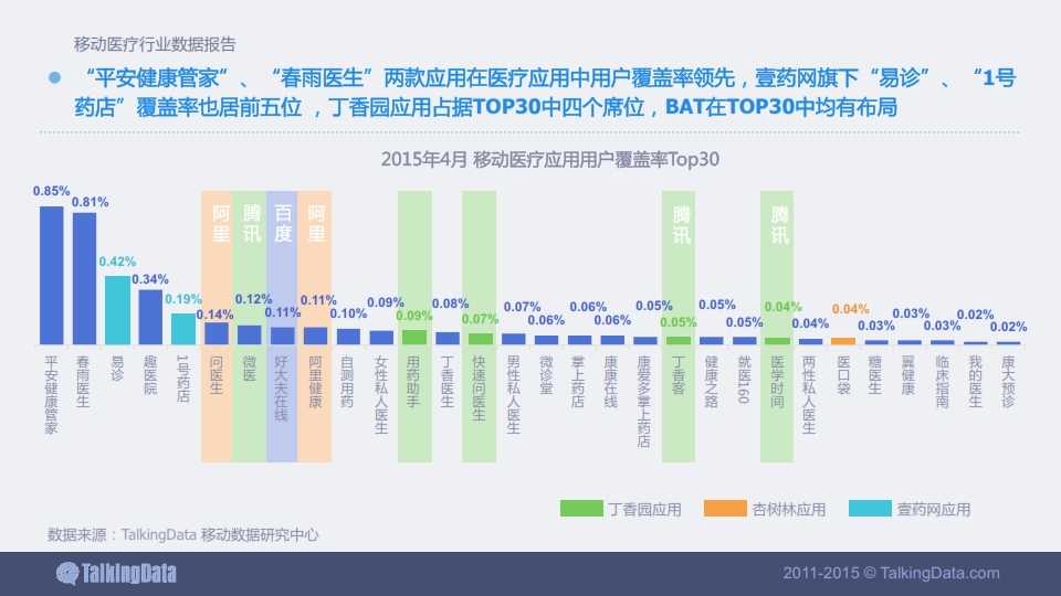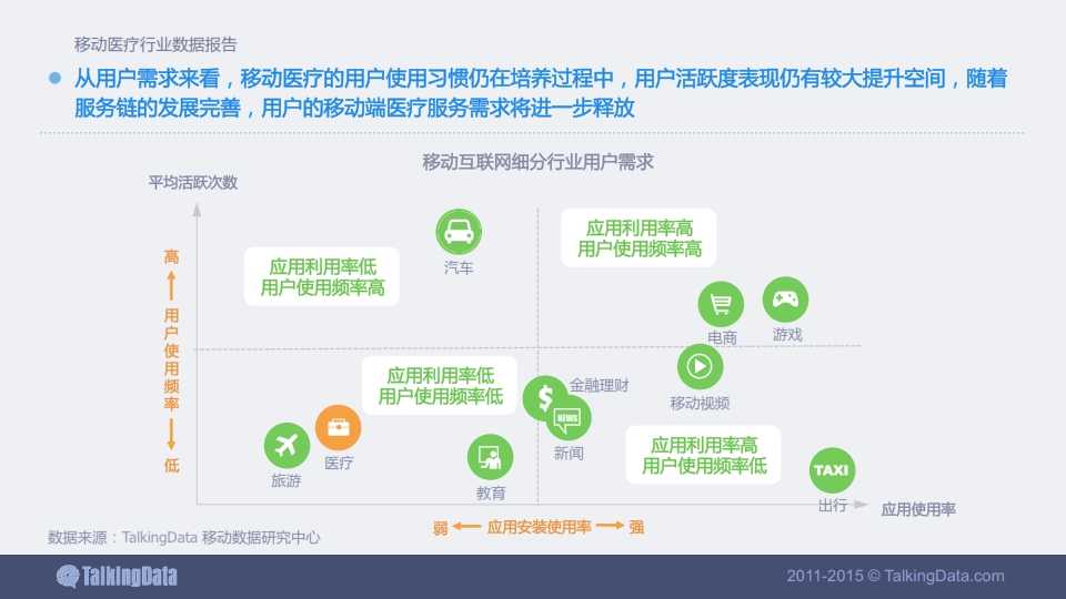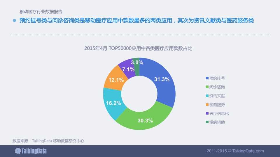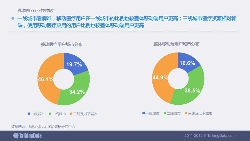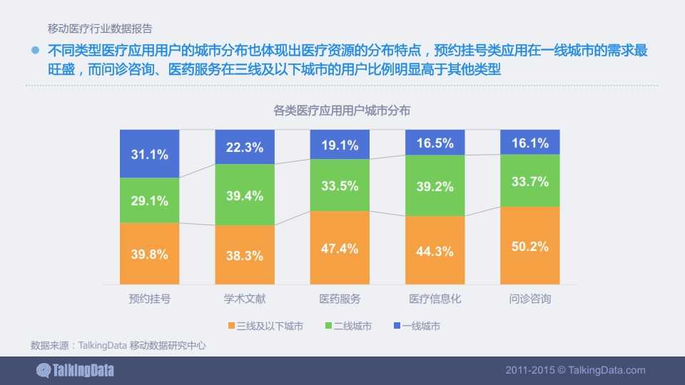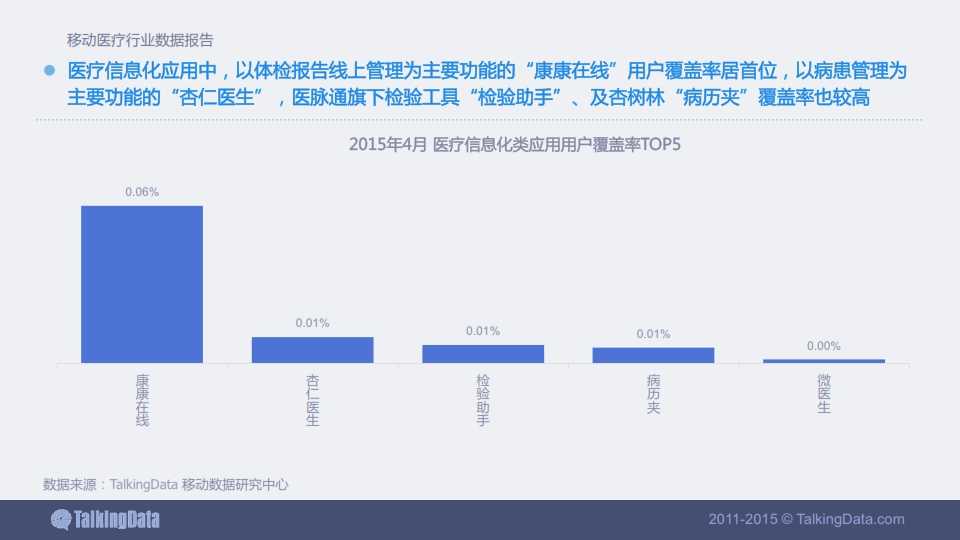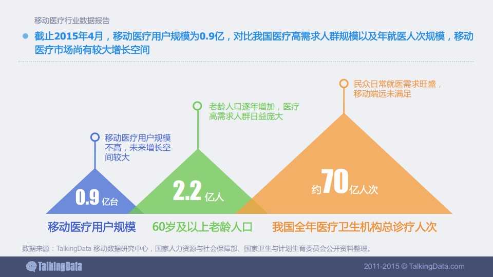 TalkingData:2015年移动医疗行业数据报告 更多阅读:TalkingData:2015年汽车移动应用行业数据报告2015年移动医疗领域十大关键词StartUp Health:2015年度移动医疗融资仍是2013年的2倍TalkingData:2020年“超职季”招聘市场洞察报告TalkingData: 谈《捉妖》御灵师的画像洞察TalkingData:2022春节年货数据TalkingData:从瑞幸咖啡“崩盘”事件 探究咖啡消费人群特征差异TalkingData T11 2019数据智能技术峰会举办 AI将成为行业颠覆者TalkingData:“数”说瑞幸咖啡、星巴克人群特征硬核联盟:2018年移动游戏行业数据报告T11 2018数聚零售峰会举办,聚焦新零售变革突破以突破诠释数据的力量,2018年T11数据智能峰会即将举办TalkingData发布新战略布局 CEO崔晓波:要以开放连接促数据智能“和缓视频医生APP” 重磅发布 国内首个 7×24 小时视频咨询服务平台问世T11 2017 暨TalkingData智能数据峰会开幕倒计时,九大论坛前瞻