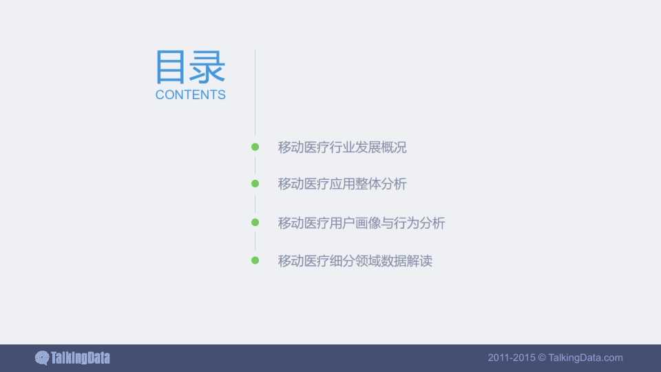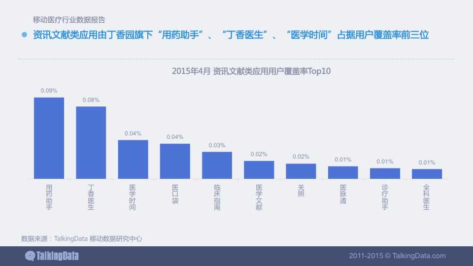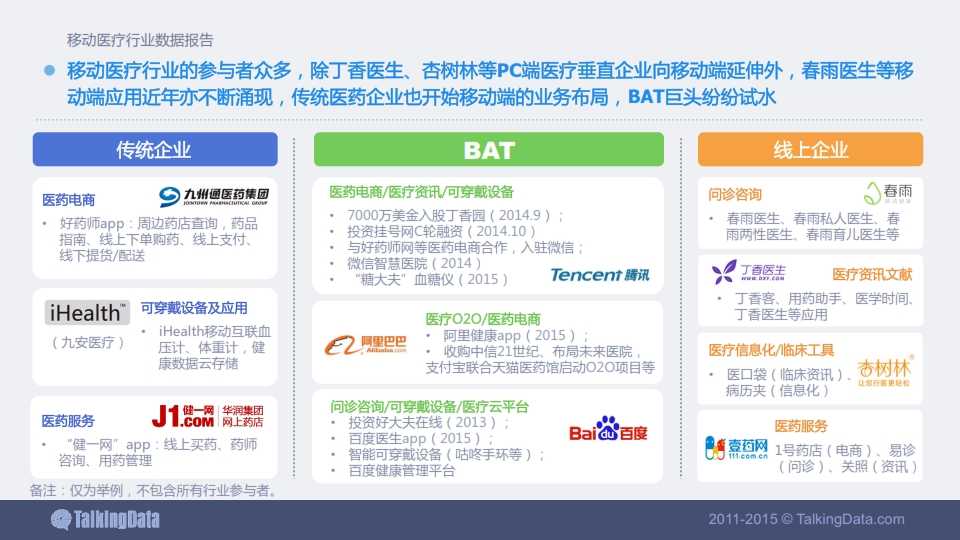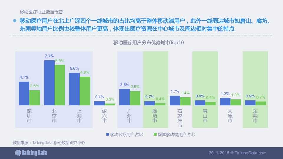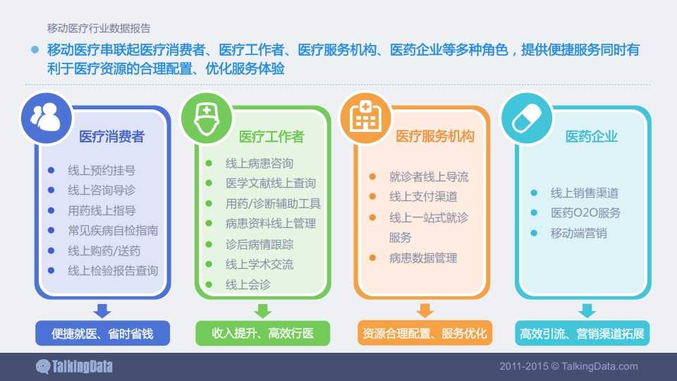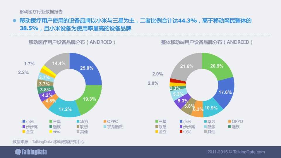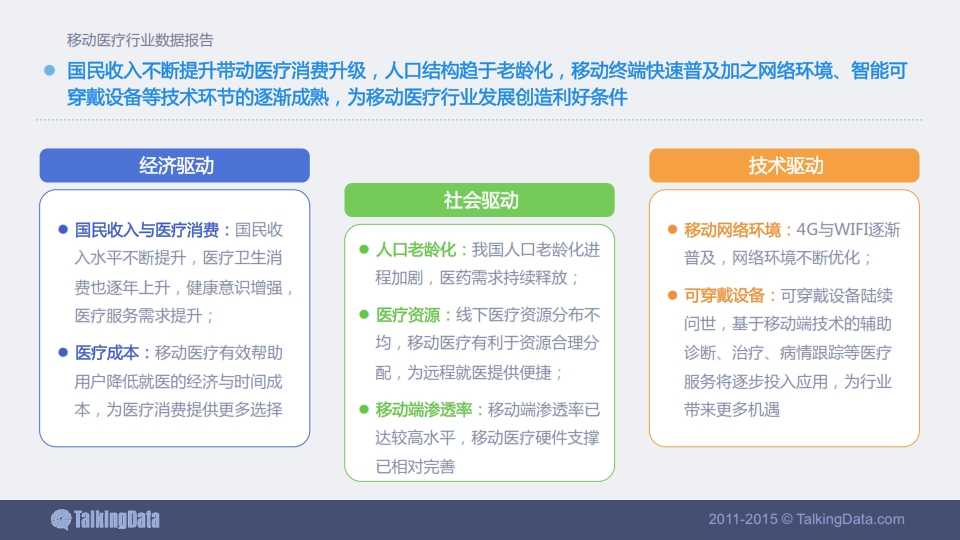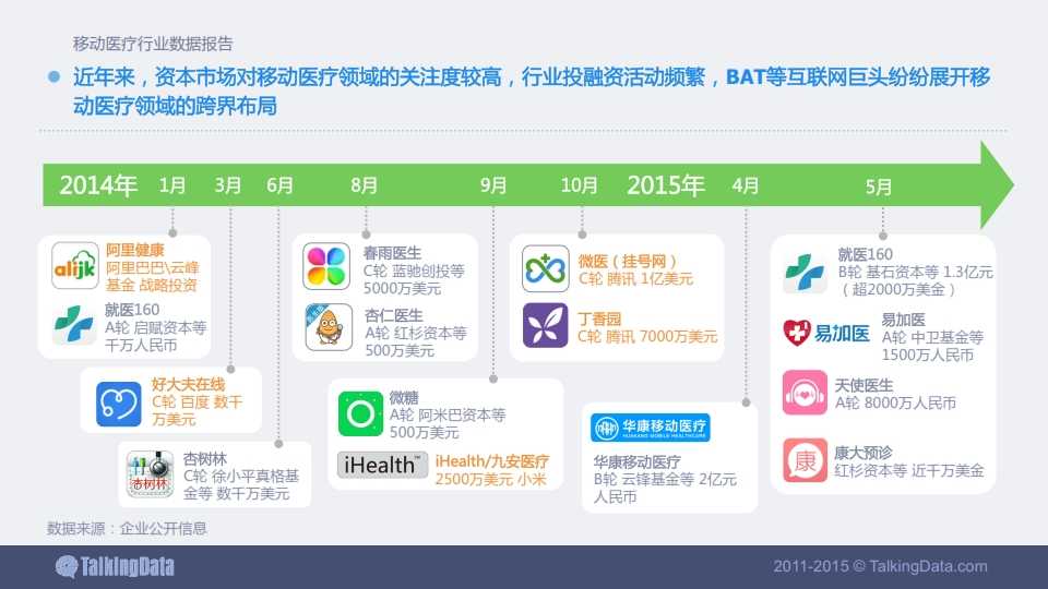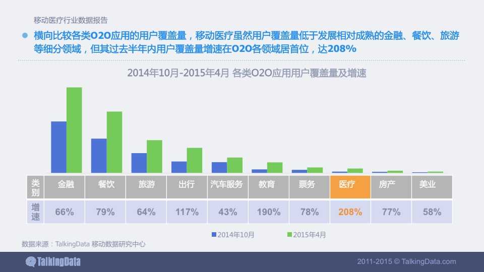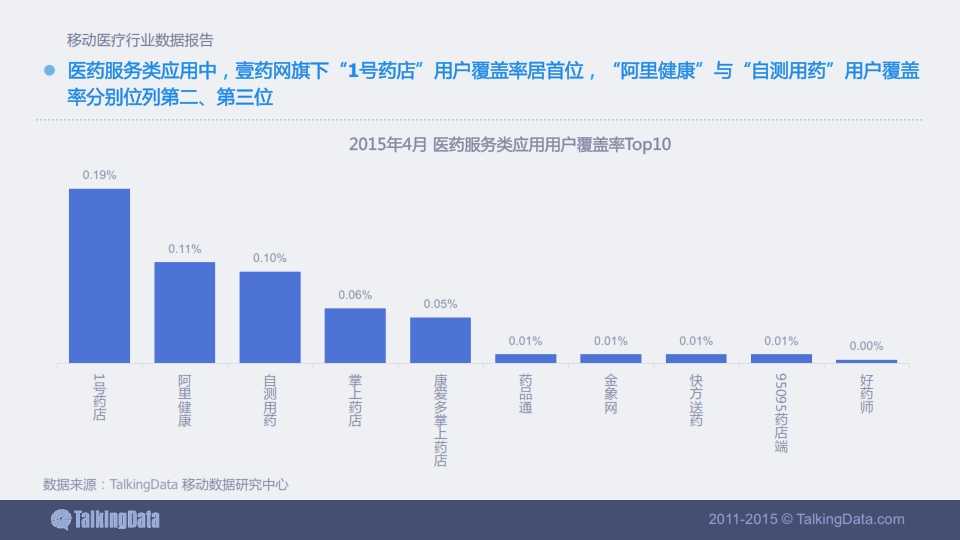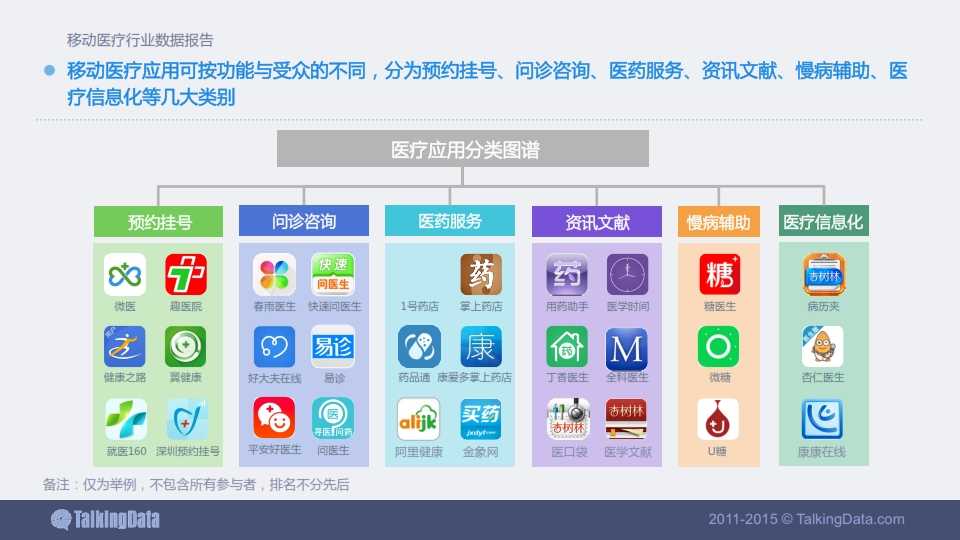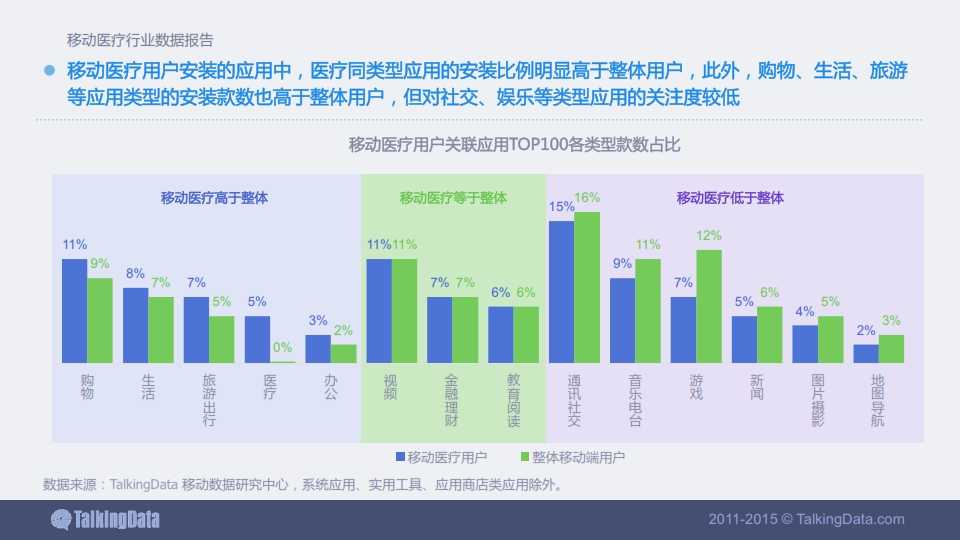 TalkingData:2015年移动医疗行业数据报告 更多阅读:TalkingData:2015年汽车移动应用行业数据报告2015年移动医疗领域十大关键词StartUp Health:2015年度移动医疗融资仍是2013年的2倍TalkingData:2020年“超职季”招聘市场洞察报告TalkingData: 谈《捉妖》御灵师的画像洞察TalkingData:2022春节年货数据TalkingData:从瑞幸咖啡“崩盘”事件 探究咖啡消费人群特征差异TalkingData T11 2019数据智能技术峰会举办 AI将成为行业颠覆者TalkingData:“数”说瑞幸咖啡、星巴克人群特征硬核联盟:2018年移动游戏行业数据报告T11 2018数聚零售峰会举办,聚焦新零售变革突破以突破诠释数据的力量,2018年T11数据智能峰会即将举办TalkingData发布新战略布局 CEO崔晓波:要以开放连接促数据智能“和缓视频医生APP” 重磅发布 国内首个 7×24 小时视频咨询服务平台问世T11 2017 暨TalkingData智能数据峰会开幕倒计时,九大论坛前瞻