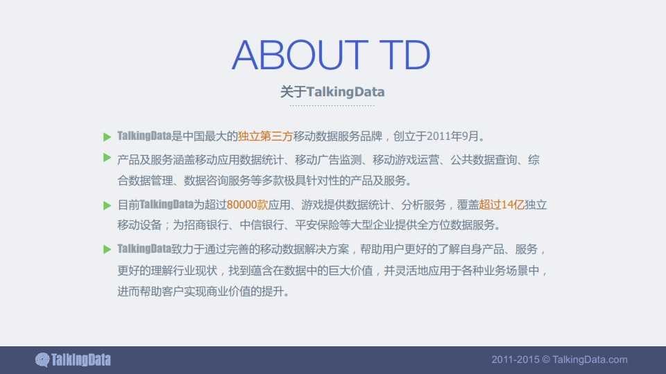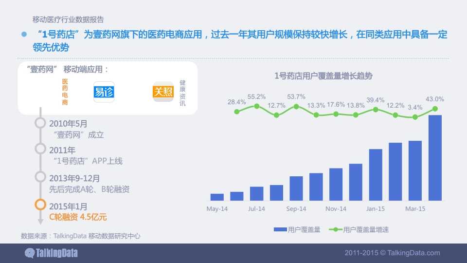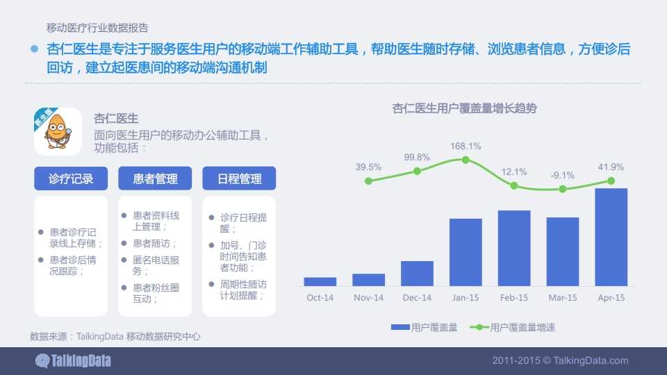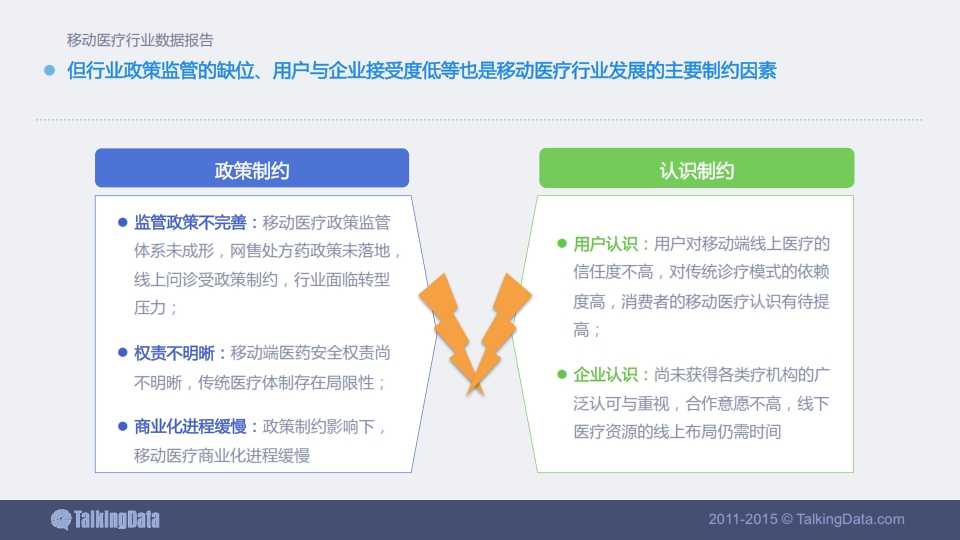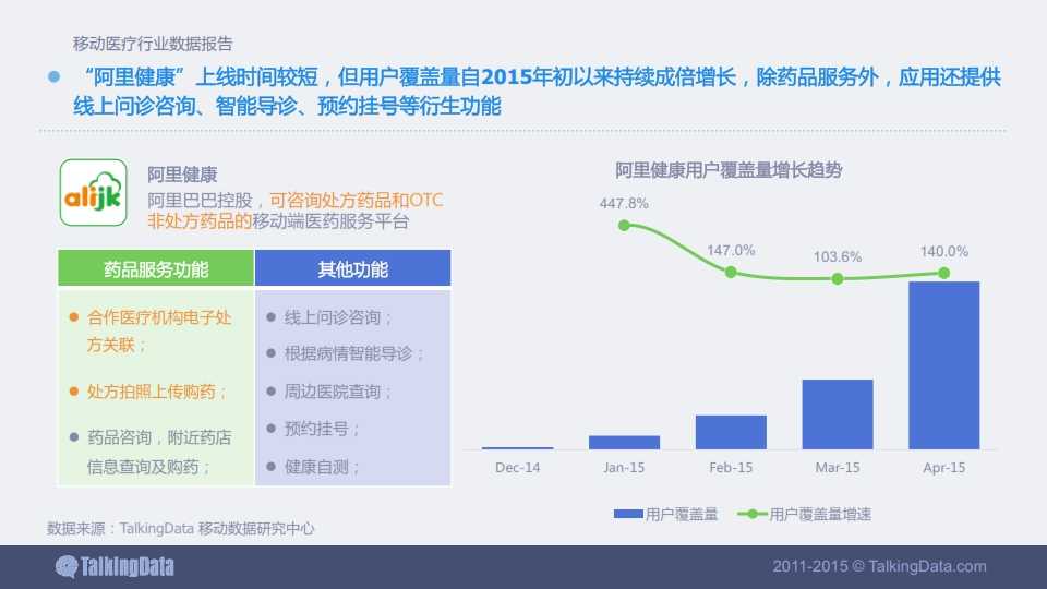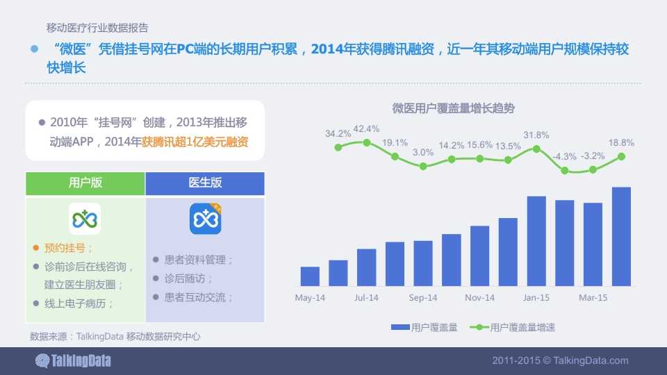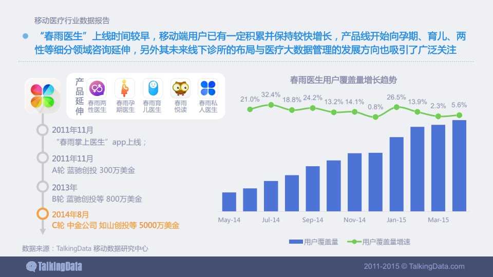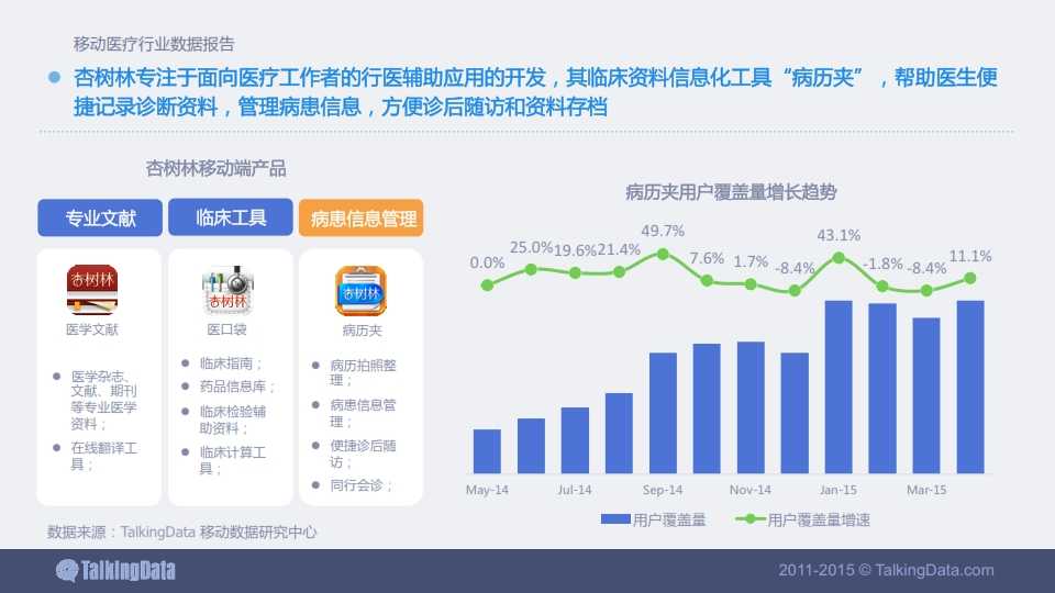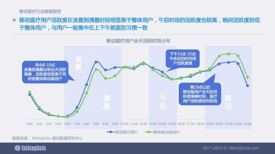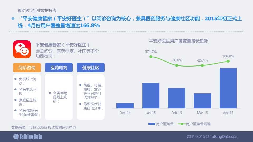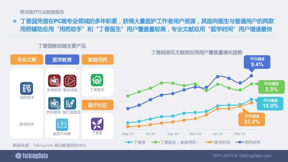 TalkingData:2015年移动医疗行业数据报告 更多阅读:TalkingData:2015年汽车移动应用行业数据报告2015年移动医疗领域十大关键词StartUp Health:2015年度移动医疗融资仍是2013年的2倍TalkingData:2020年“超职季”招聘市场洞察报告TalkingData: 谈《捉妖》御灵师的画像洞察TalkingData:2022春节年货数据TalkingData:从瑞幸咖啡“崩盘”事件 探究咖啡消费人群特征差异TalkingData T11 2019数据智能技术峰会举办 AI将成为行业颠覆者TalkingData:“数”说瑞幸咖啡、星巴克人群特征硬核联盟:2018年移动游戏行业数据报告T11 2018数聚零售峰会举办,聚焦新零售变革突破以突破诠释数据的力量,2018年T11数据智能峰会即将举办TalkingData发布新战略布局 CEO崔晓波:要以开放连接促数据智能“和缓视频医生APP” 重磅发布 国内首个 7×24 小时视频咨询服务平台问世T11 2017 暨TalkingData智能数据峰会开幕倒计时,九大论坛前瞻