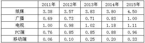 2011-2015年 各渠道广告收入百分比/用户各渠道时长百分比 比值表
