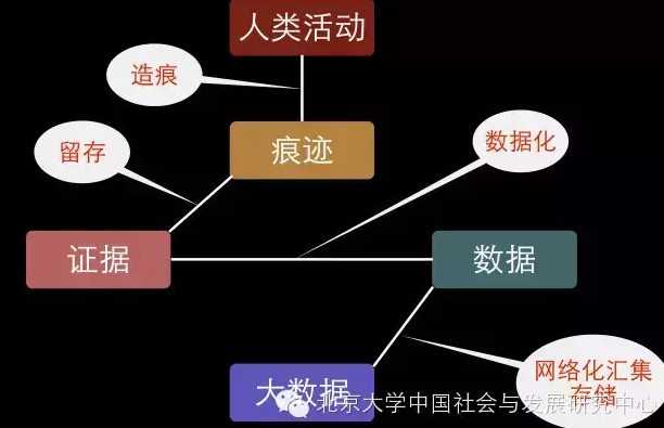 对社会学研究,我们最熟悉的是社会活动,我称其为人类活动。其实今天,不仅仅社会活动,你的私密活动也在数据之中,我没有加“社会”两个字,道理就在于人类的活动都在慢慢地数据化。在人类活动中,有一个概念叫做造痕,考古挖掘的,就是人类社会生活留下的痕迹。过去,我们通常拿这些痕迹做证据,比如考古学、历史学和社会学的许多研究活动。这些证据有一些会被数据化,数据化了的证据就叫做数据。