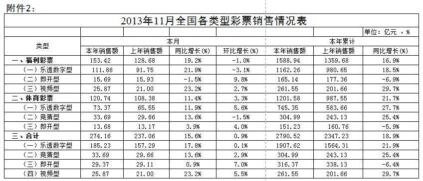 11月份,全国共销售彩票274.16亿元,比上年同期(以下简称“同比”)增加37.1亿元,增长15.6%。其中,福利彩票机构销售153.42亿元,同比增加24.74亿元,增长19.2%;体育彩票机构销售120.74亿元,同比增加12.36亿元,增长11.4%。本月彩票销售量增长较快,主要是由于部分省市调整和上市快速开奖游戏、中福在线部分游戏扩大销售试点范围、彩票营销推广力度加大,乐透数字型、竞猜型、视频型彩票销售量增加较多。