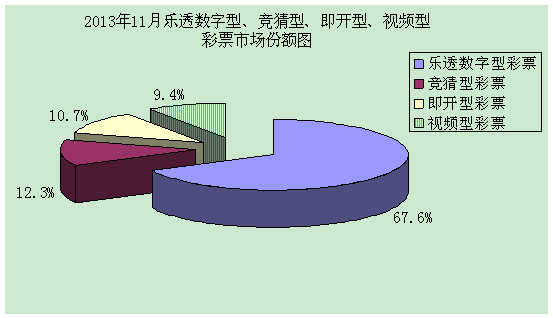 11月份,乐透数字型彩票销售185.23亿元[1],同比增加27.94亿元,增长17.8%;竞猜型彩票销售33.69亿元,同比增加4.03亿元,增长13.6%;即开型彩票销售29.37亿元,同比增加0.26亿元,增长0.9 %;视频型彩票[2]销售25.87亿元,同比增加4.87亿元,增长23.2%。11月份乐透数字型、竞猜型、即开型和视频型彩票销售量分别占彩票销售总量的67.6%、12.3 %、10.7%、9.4%。