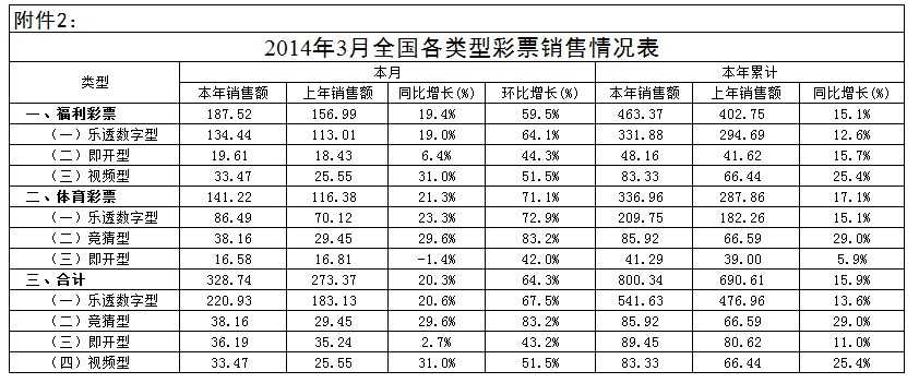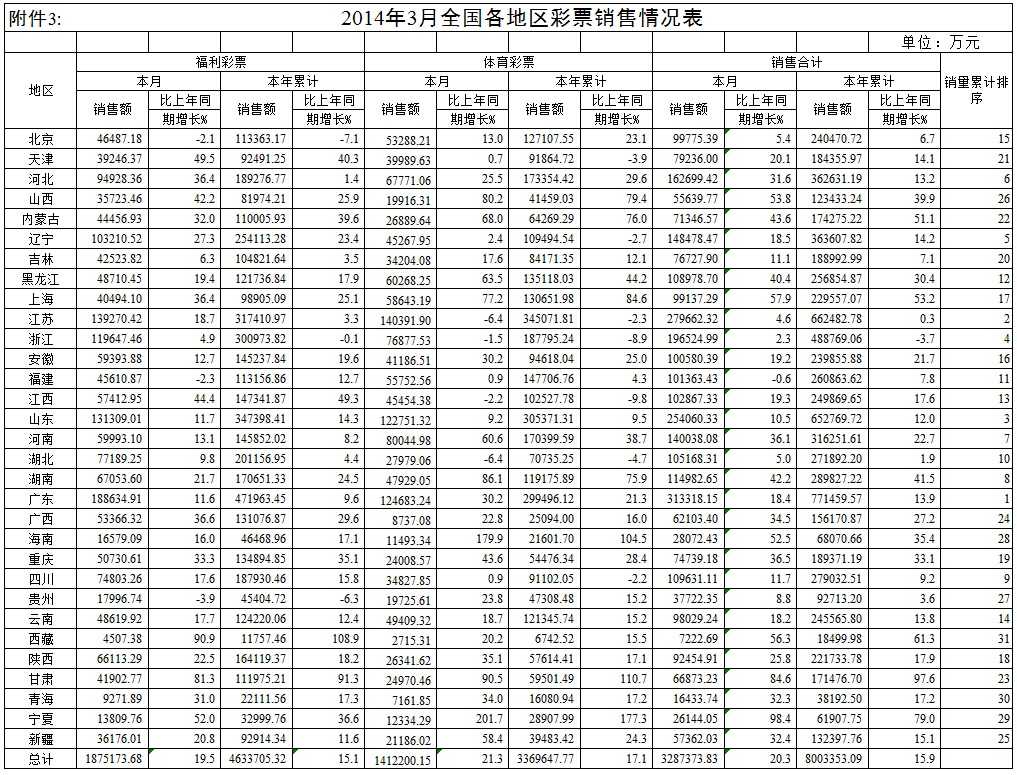3月份,全国共销售彩票328.74亿元,比上年同期(简称“同比”)增加55.37亿元,增长20.3%。其中,福利彩票机构销售187.52亿元,同比增加30.53亿元,增长19.4%;体育彩票机构销售141.22亿元,同比增加24.84亿元,增长21.3%。