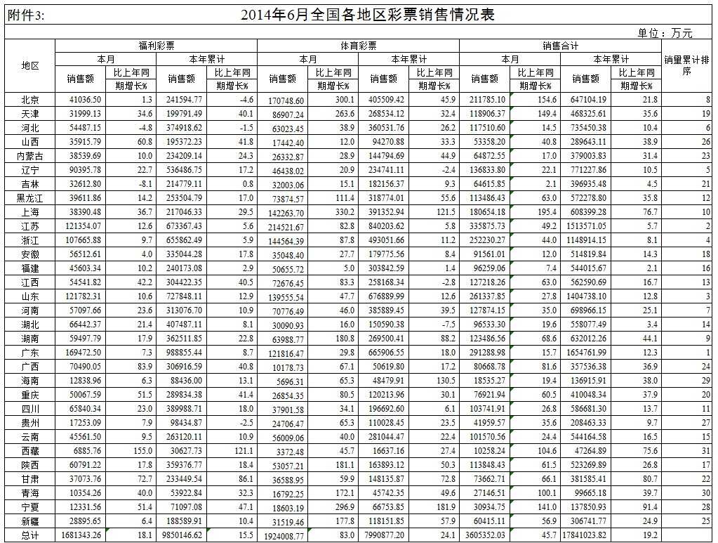 2014年6月全国各地区彩票销售情况表